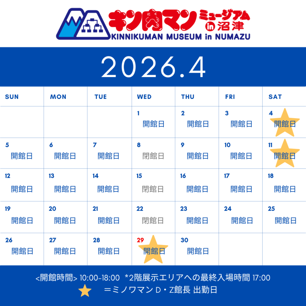 4月の施設開館日、及びミノワマンD・Z館長出勤日は、以下カレンダーのとおりの予定です。
